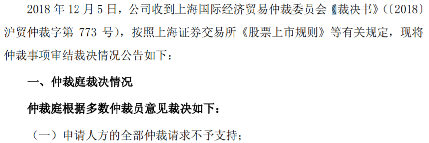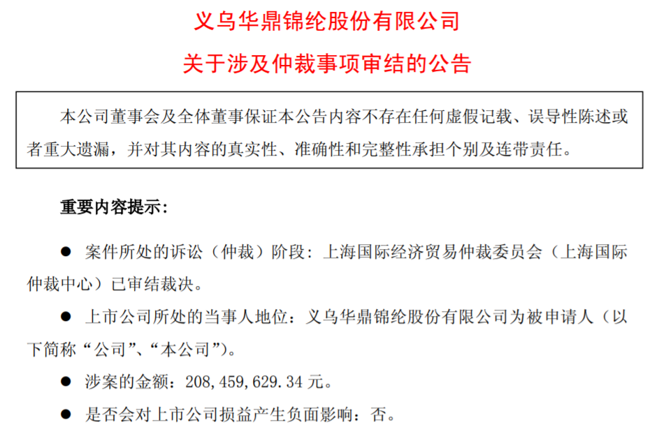 同年12月,华鼎股份发布了有关仲裁审结的公告,依据上海国际经济贸易仲裁委员会《裁决书》(〔2018〕沪贸仲裁字第773号),申请人方的全部仲裁请求不予支持。本案仲裁费人民币1,446,633元,全部由申请人方承担,并与申请人方全额预缴的仲裁费相冲抵。该裁决为终局裁决,自作出之日起生效。