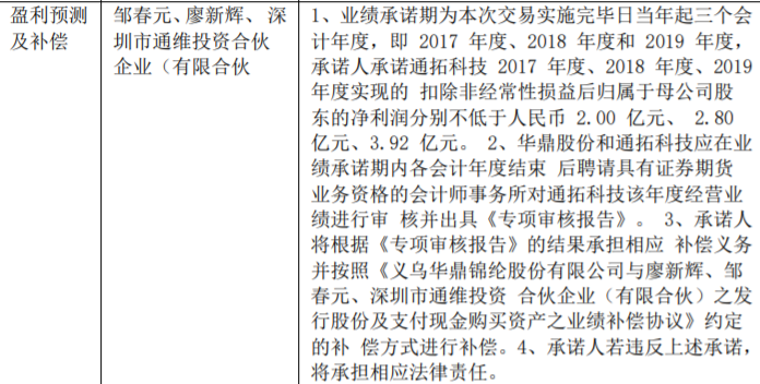 在当年与华鼎股份签订的股权转让协议中,通拓科技股东廖新辉、邹春元和深圳市通维投资合伙企业(有限合伙)(以下简称 "业绩承诺方")承诺,通拓科技2017 年、2018 年、2019 年实现的扣除非经常性损益后归属于母公司股东的净利润分别不低于人民币2.00 亿元、2.80 亿元、3.92 亿元。换句话说,通拓要在三年时间里累计完成净利润8.72亿,才能兑现业绩承诺。