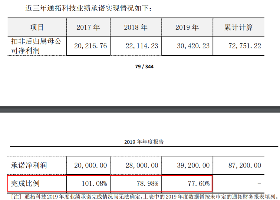 然而,通拓仅在2017年完成了业绩对赌,2018年和2019年连续两年均未完成业绩承诺。