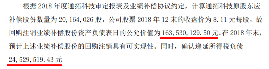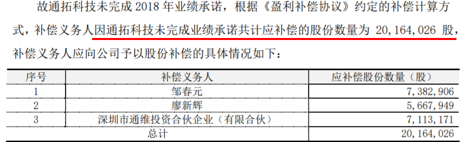 据了解,2017年、2018年、2019年经审计后通拓科技实现扣非后净利润分别为2.02亿元、2.21亿元、3.04亿元,因此2018、2019连续两年未完成业绩承诺。