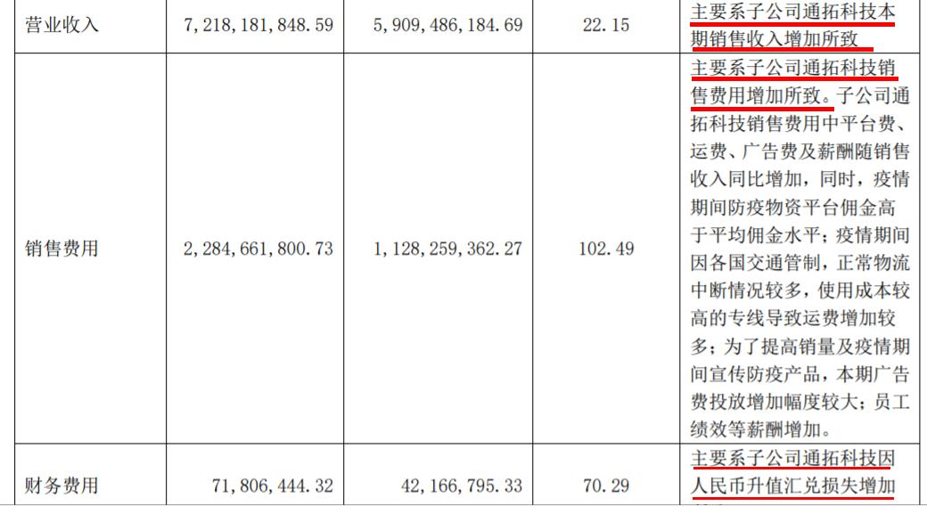 该Q3季度报告指出,华鼎股份电商板块受国外疫情影响,销售费用大幅增加所致。从下图可以看到,通拓科技的销售成本(包括佣金、运费、广告费等)较2019年同期上涨了102%,财务费用受人民币升值汇损影响,损失增加了70%!