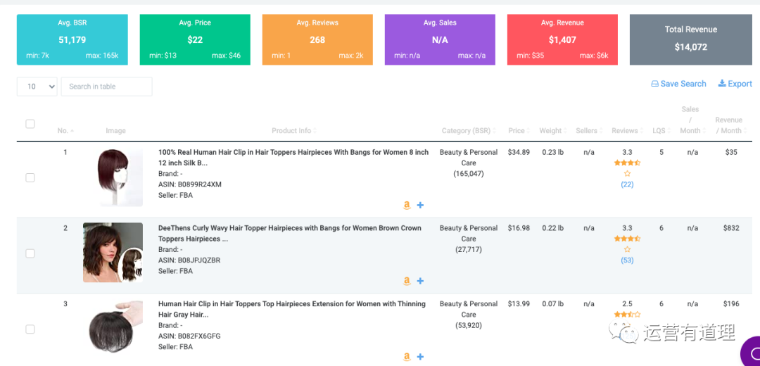 1、查询搜索结果页后,出现如下界面,比较有价值的是显示了月销量和月销售额估算两个字段
