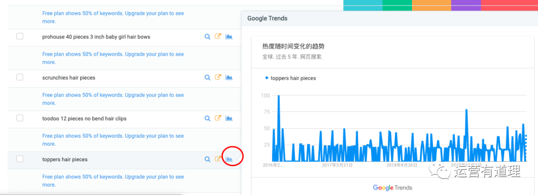 11、点击第三个小图标,显示关键词的谷歌趋势数据,如下图