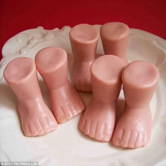 娃娃脚形状肥皂。想像一下用这种肥皂洗手是什么样的感受?