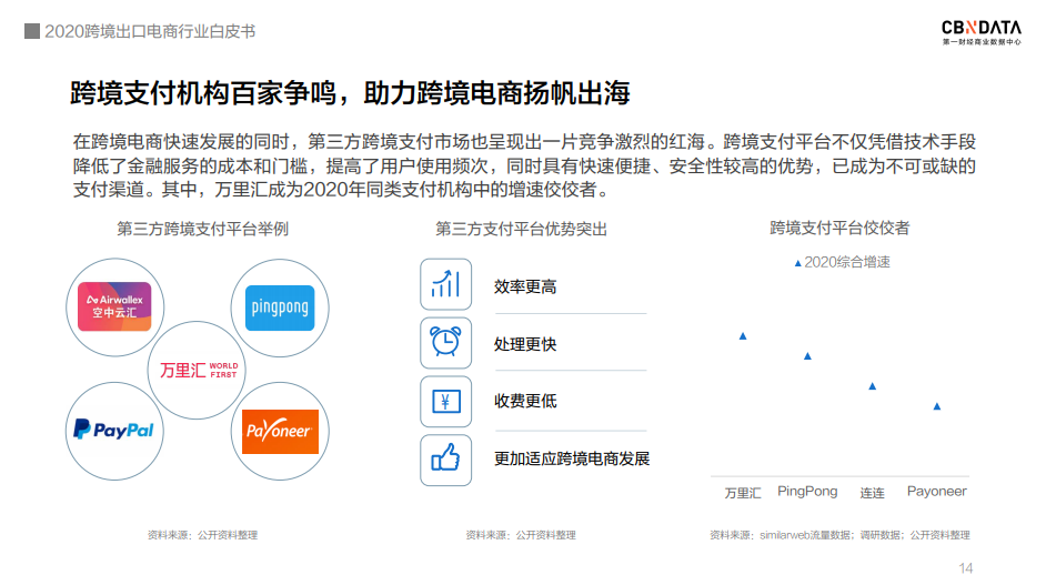 作为服务链路的另一关键环,第三方跨境支付市场也在蓬勃发展。万里汇(WorldFirst)等跨境支付机构百家争鸣,通过与境内持牌机构合作,共同助推跨境电商乘风破浪。CBNData《报告》指出,跨境支付平台不仅凭借技术手段降低了金融服务的成本和门槛,提高了用户使用频次,同时具有快速便捷、安全性较高的优势,已成为不可或缺的支付渠道。