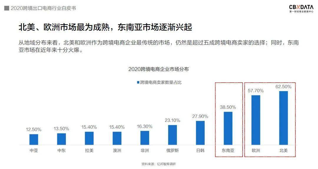 从电商平台来看,跨境电商企业正在深度融入全球市场。其中北美、欧洲市场最为成熟,是超过五成跨境电商卖家的选择。值得注意的是,东南亚市场近年来十分火爆,成为仅次于欧美的第三大新兴市场。Lazada、Shopee等跨境电商平台兴起,开展大规模中国商家招募,为国货出海带来了新风口。