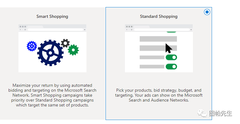 然后选标准购物(必应的话我不建议用智能购物广告,因为感觉微软的学习机制没谷歌的优秀)
