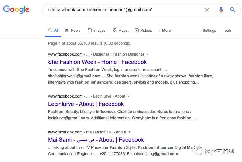 这句话,表示要查询 Facebook上包含gmail.com的 时尚网红。