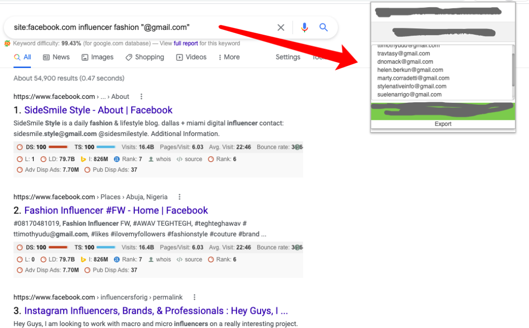 fashion influencer可以更换成你想要的关键词,@gmail.com可以更换成你想要的邮箱类型,比如:@yahoo.com、@live.com等