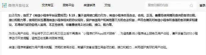 所以2021年5月20日后,微信将收回所有小程序跳转APP功能,有在微信上线小程序的团队自己调整,避免小程序正常使用。