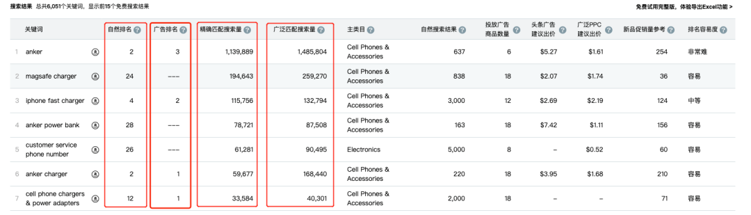 如下图所示,通过这款免费的关键词工具,我们可以查询到竞品任意ASIN的主要流量关键词,而且还能看到每个关键词对应的自然排名、广告排名,以及不同匹配模式下的搜索量(过去30天)。