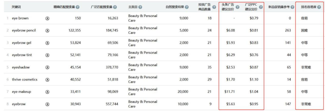 这款免费的关键词工具,除了可以反查ASIN,还能查询目标关键词的数据。如下图所示,对于每一个关键词,该工具会提供头条广告和广泛PPC的建议出价,供卖家参考,并且给出新品使用该关键词提升排名的难易程度。