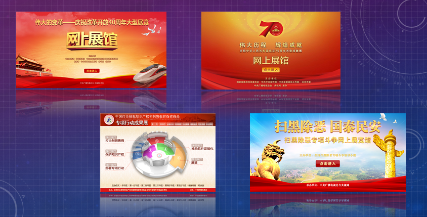 通过深耕政务网上展馆建设,打造一系列创新型式、重大主题报道的优势特色产品。其中包括“庆祝改革开放40周年大型展览”网上展馆、打击侵犯知识产权和制售假冒伪劣商品专项行动成果展、扫黑除恶专项斗争网上展馆以及即将上线的脱贫攻坚相关成果展。