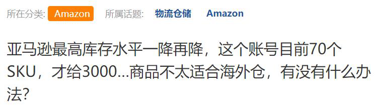 而在知无不言论坛上,卖家抱怨限制发货的声音也是不绝于耳。其中一位卖家发帖吐槽道:亚马逊最高库存水平一降再降,这个账号目前70个SKU,才给3000…