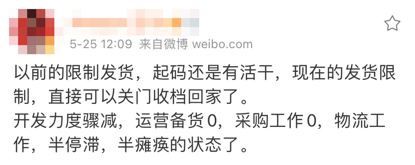 有卖家在微博上吐槽道:以前的限制发货起码还有活干,这次直接可以关门收档回家了。