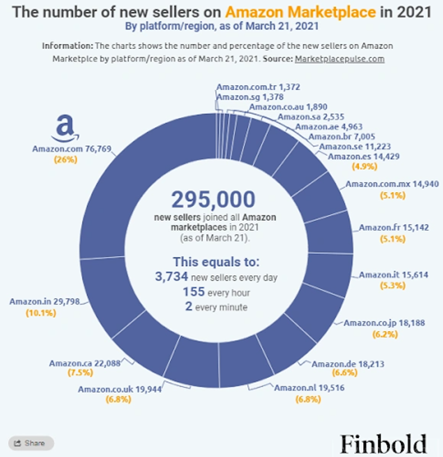 而且,由于去年亚马逊卖家普遍都赚到钱了,吸引了众多行业外的目光,导致今年新卖家的数量呈几何式的增长,除了个人创业者以外,很多大资本以及有供应链优势的工厂贸易商也都纷纷入局,光今年第一季度的新卖家增量,就快赶上去年的总和了。