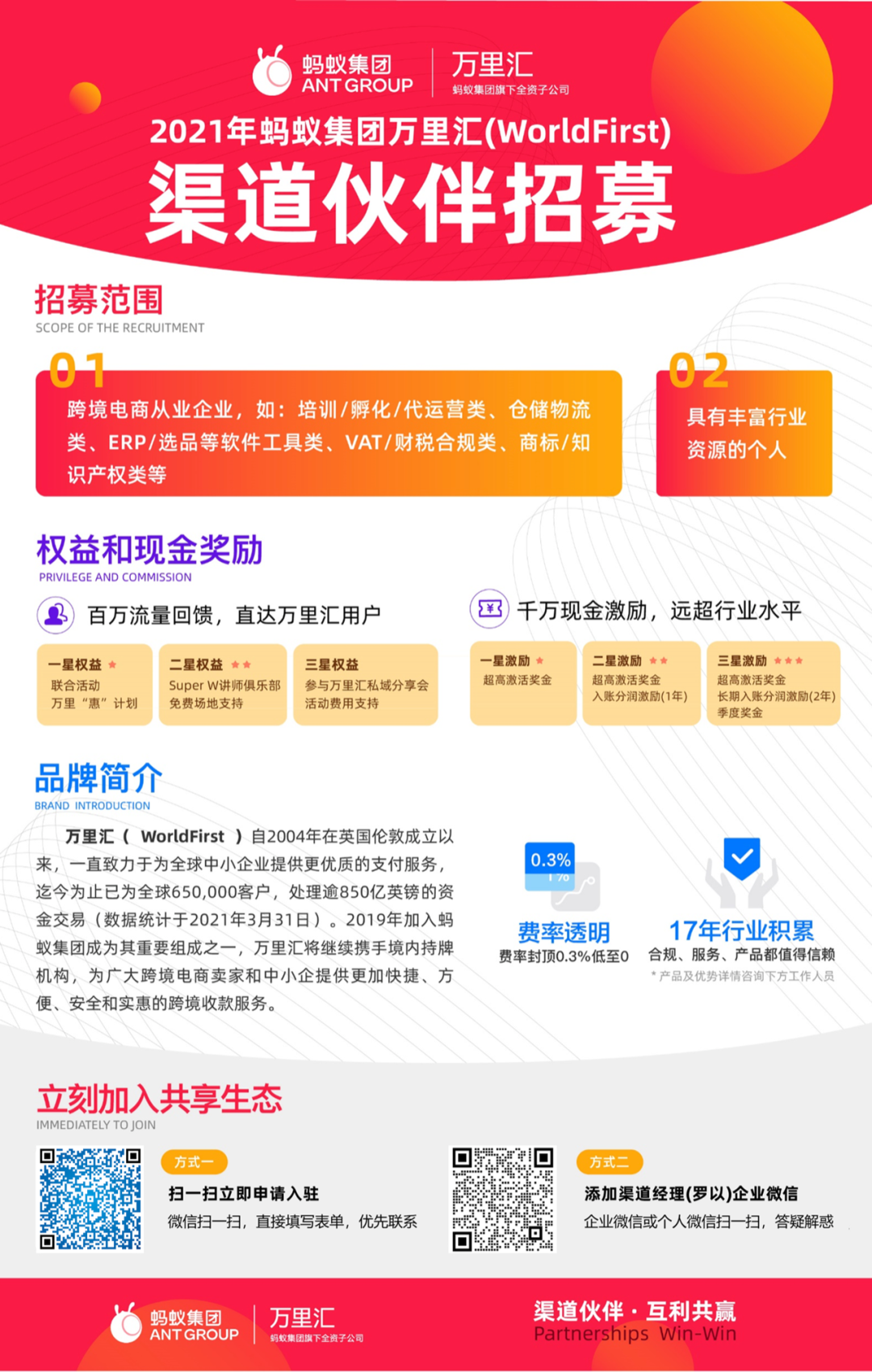 【跨境服务商集结令】2021年蚂蚁集团万里汇(WorldFirst)渠道伙伴招募正式开启,个人或企业均可报名
