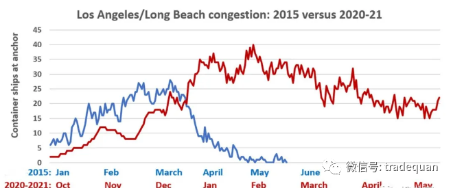 不过他对近几周来洛杉矶/长滩港口拥堵的持续改善感到有些乐观。根据南加州海洋交易所的数据,周二有20艘集装箱船停泊并等待泊位,低于周一的22艘。洛杉矶长滩的锚泊船只在2月最多达到40艘。