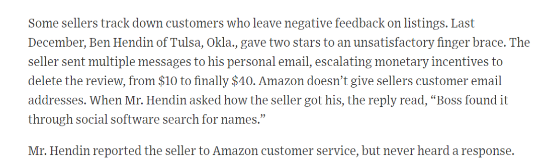 此外,报道里面还额外提到了修改差评的事情:很多买家在留完差评以后,会收到来自于卖家要求修改差评的邮件,大致意思就是花个几十美金作为补偿,让买家帮忙删掉评价,很多买家不甚其扰就把卖家举报给了亚马逊,早些时候亚马逊是不怎么管这类问题的,但是随着遇到此类问题的买家越来越多,其中还关乎到买家个人信息泄露的问题,所以我预估后续对于这方面亚马逊也应该也会加大打击的力度。在这里我也建议各位老铁也不要再去找服务商买邮箱去搞什么现金诱惑删差评了,后面这种行为的风险会越来越大!