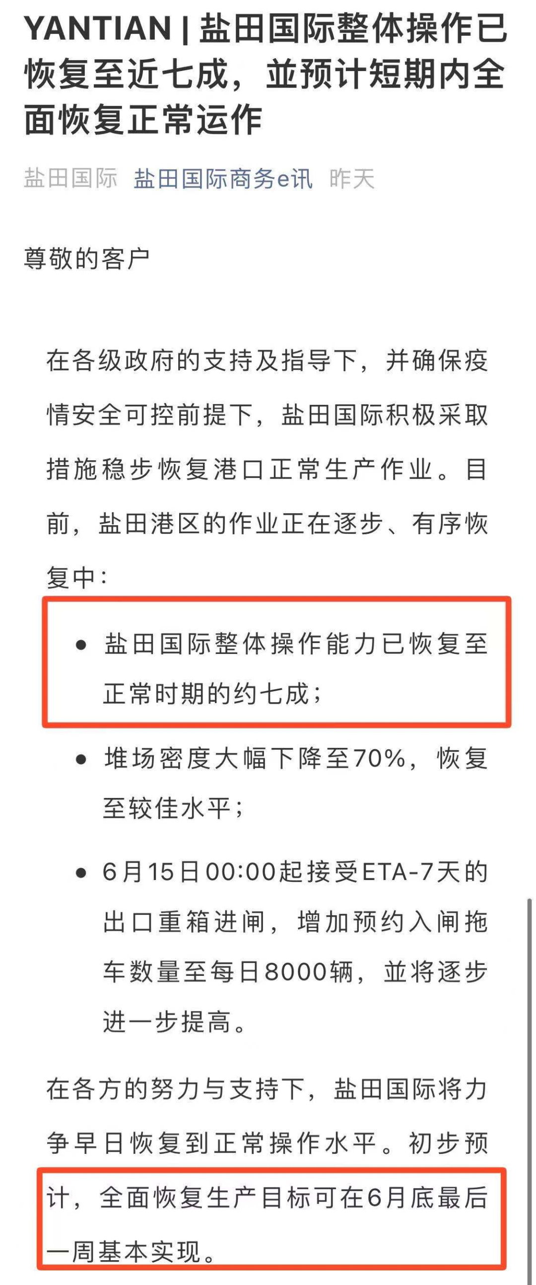 近期的海运好消息则是,根据盐田国际6月15日发布公告称,其整体操作能力已恢复至正常时期约七成,将在6月底全面恢复。