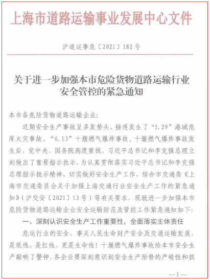 6月18日,上海市道路运输事业发展中心发布关于进一步加强本市危险货物道路运输行业安全管控的紧急通知。