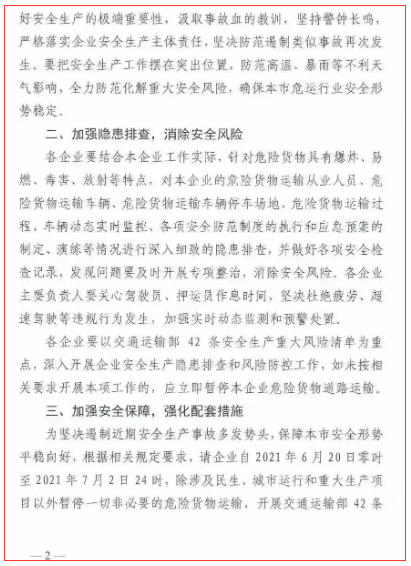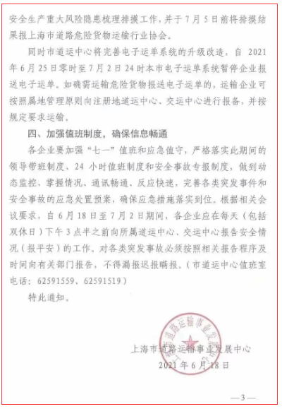 为坚决遏制近期安全生产事故多发势头,保障本市(上海)市安全形势平衡向好,根据相关规定要求,需要请企业自2021年6月20零时至2021年7月2日24时,除涉及民生,城市运行和重大生产项目以外暂停一切非必要的危险货物运输,开展交通运输部42条安全生产重大风险隐患梳理排摸工作,关于7月5日前将排摸结果报上海市道路危险货物运输行业协会。
