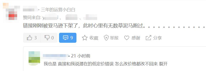 一位卖家在微博上吐槽:链接刚刚被亚马逊下架了,告知我潜在的低定价错误,怎么改价格都改不回来,此时心中有无数草泥马跑过……