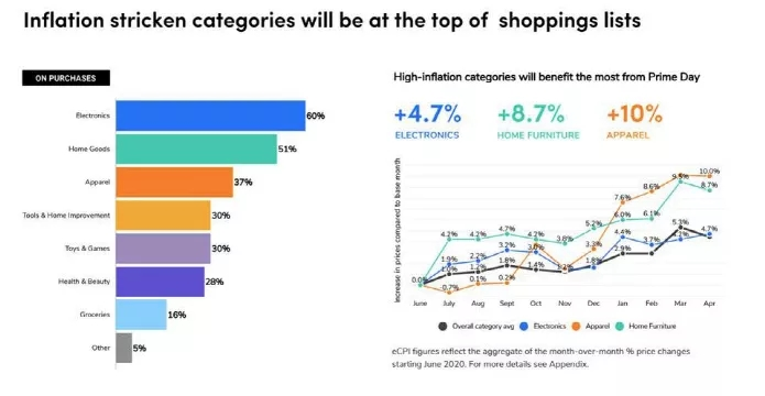 今年的Prime day哪些类目更容易爆单呢?据Profitero数据显示,越容易受通货膨胀影响的品类/类目,在买家购物清单中排名就越靠前,越容易在Prime Day获得高销量。