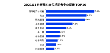 从核心岗位求职者专业背景来看,与行业对口情况较好,国际经济与贸易最为普遍,占比7.4%,物流管理、工商管理、会计学、市场营销、电子商务等经管类专业也均位列前十。此外,由于外贸对语言能力的要求,毕业于英语(6.2%)、商务英语(3.1%)、日语(1.6%)等专业求职者在外贸进出口行业中占比也相对较高。