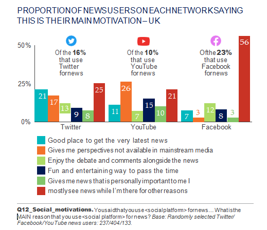 以英国为例,下图描述了Twitter、TouTube和Facebook三大网络平台上新闻用户的占比,反映出用户使用该平台获取新闻的主要动机。