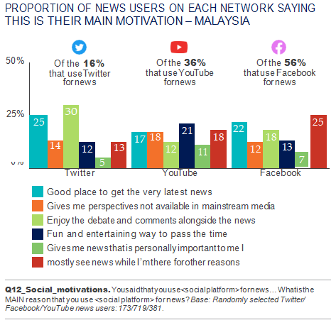数据显示,在马来西亚,Facebook更像是新闻产地(22%的用户如此认为),与英国相比,称自己只是偶然看到新闻的用户比例更小。虽然Twitter的用户比例较低,但它最受关注的是最新消息,尤其是不同阵营群体的交锋。