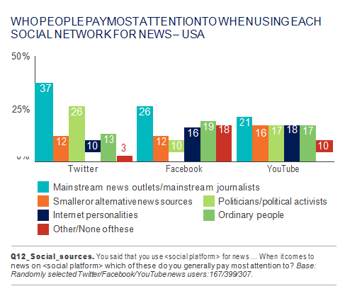 我们在大多数市场的新闻来源上都看到了这种模式。许多社交媒体新闻用户表示,他们对Facebook和Twitter平台上的主流媒体关注最多。但即便如此,老牌新闻机构记者也必须与一系列往往更有吸引力、更尖锐的声音竞争。
