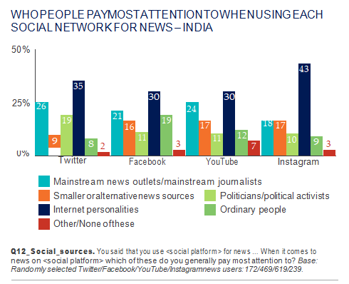 在其他地方,多元观点占比更为突出。例如,在印度,名人以及意见领袖的观点在四大网络平台(Twitter、Facebook、YouTube和Instagram)中最受关注。其中,Facebook用户在访问新闻时,会像关注记者或新闻机构一样关注普通人;而Twitter的用户对政治家的关注(19%)几乎和对记者或新闻机构(26%)的关注一样多。
