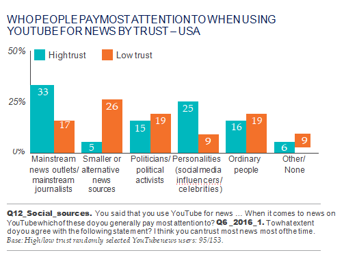 一般来说,相较于关注主流新闻渠道,那些对新闻信任度较低的人,往往更有可能寻找多元观点作为替代性信源,美国的YouTube的用户尤其如此。研究表明,那些信任度较低的用户关注替代性来源的可能性是其他人的五倍。
