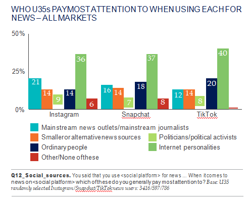 相比之下,Instagram、Snapchat和TikTok的情况则有所不同,普通人的观点日趋重要。即使涉及新闻内容,受众们也更易追逐名人或其他意见领袖的观点,而将专业记者抛之脑后。