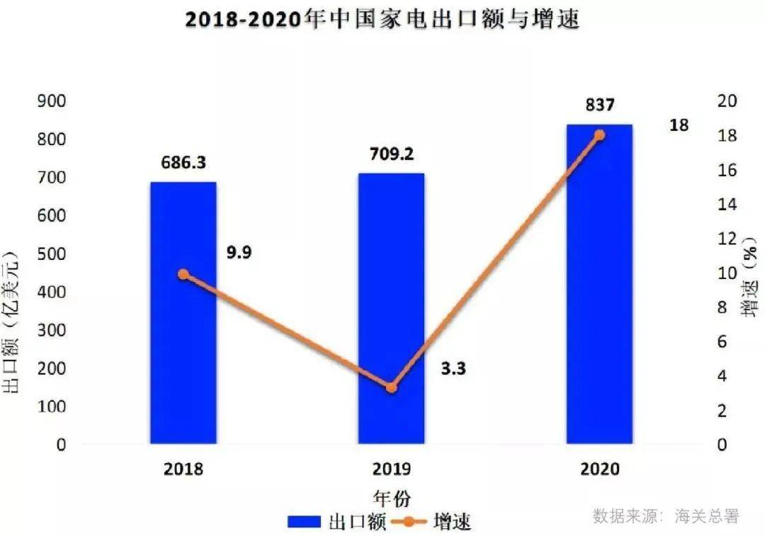 2020年中国家电行业出口持续增长,且规模持续创新历史最好水平。海关总署数据显示,2020年我国家电行业出口额为4582亿元(品类不含彩电),同比增长24.2%;2020年12月当月,中国家用电器出口额同比增长58.6%,连续7个月两位数增长。