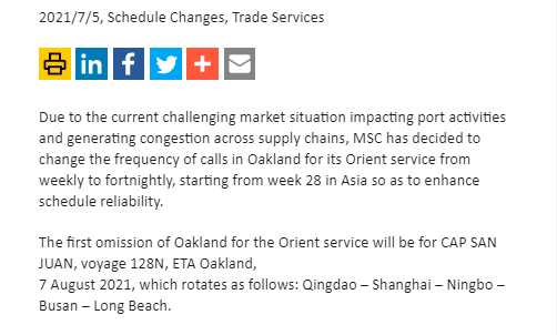 MSC在一份声明中称,由于当前具有挑战性的市场形势影响了港口活动,并造成供应链拥堵,TP8/Orient服务将每两周挂靠一次奥克兰港。