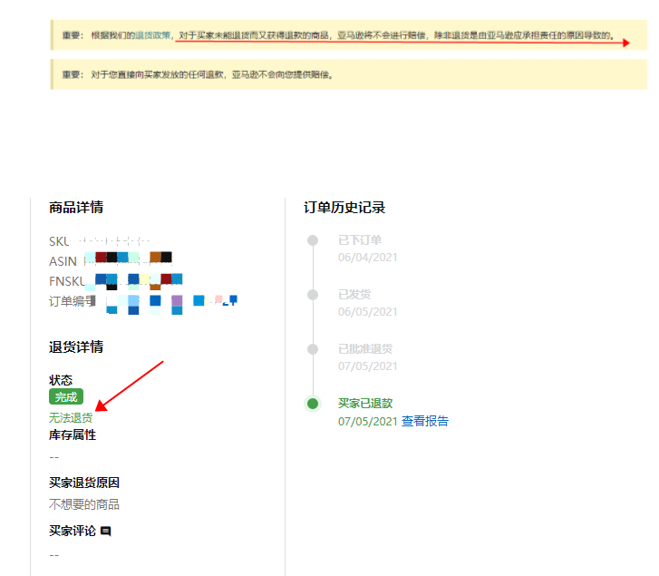 但是,所有的事并不都那么悲观,对于FBA卖家来说或许还有活路。有卖家开case从客服处得知:订单系统中备注“买家暂时无法退货”,根据产品类目不同,亚马逊的政策规定买家需在45-60天内将商品退回亚马逊库房。如果没有按时退回,卖家可以向亚马逊申请赔偿。
