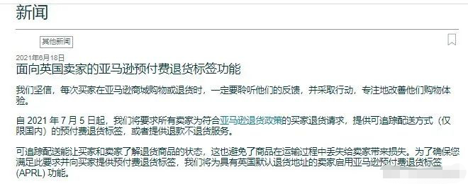 到了今年6月,亚马逊方依旧将退货时间延长,但并不只是单单延长退货时限而已。亚马逊在大促前就已发布了面向英国买家的亚马逊预付费退货标签功能,其中提到,自7月5日起,所有卖家可以为买家提供退款不退货服务。