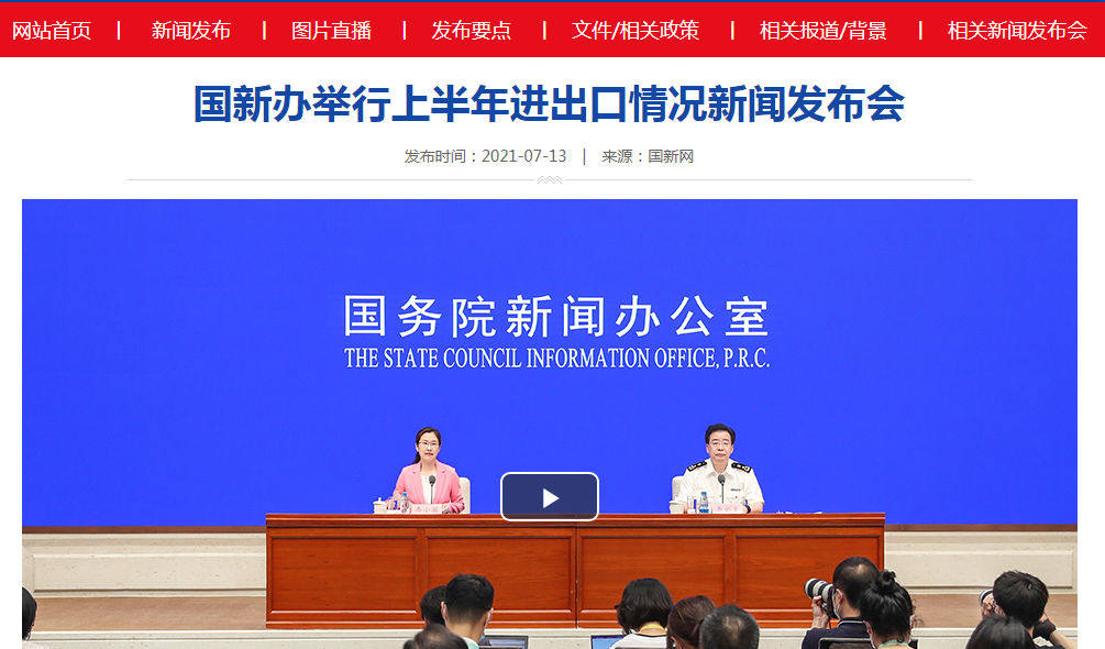 7月13日,国务院新闻办召开新闻发布会,海关总署统计分析司司长李魁文介绍,今年上半年,我国外贸进出口总值18.07万亿元,比去年同期增长27.1%。