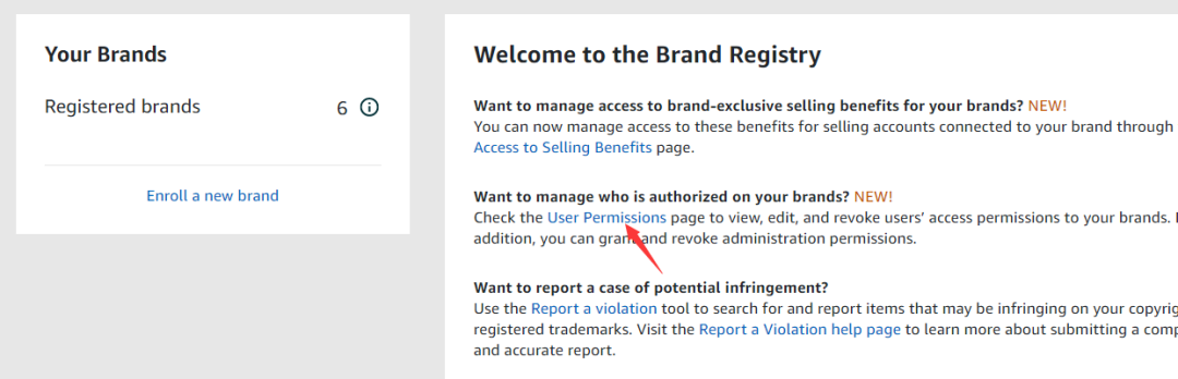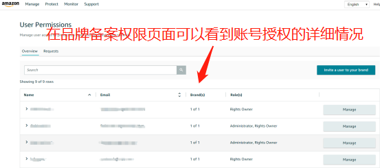 点击品牌备案页面中的“User Permissions”,可以看到品牌在其他店铺的备案和授权情况。这也就意味着亚马逊对品牌关联的情况十分清楚,一旦出现操控评论等违规操作,所有店铺都将危险!