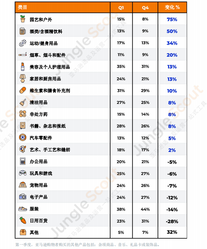 亚马逊消费情况(按类目):季度变化2021年第一季度在亚马逊上购买各种产品的消费者与2020年第四季度的情况对比。来源:Jungle Scout 2021年Q2消费者趋势报告