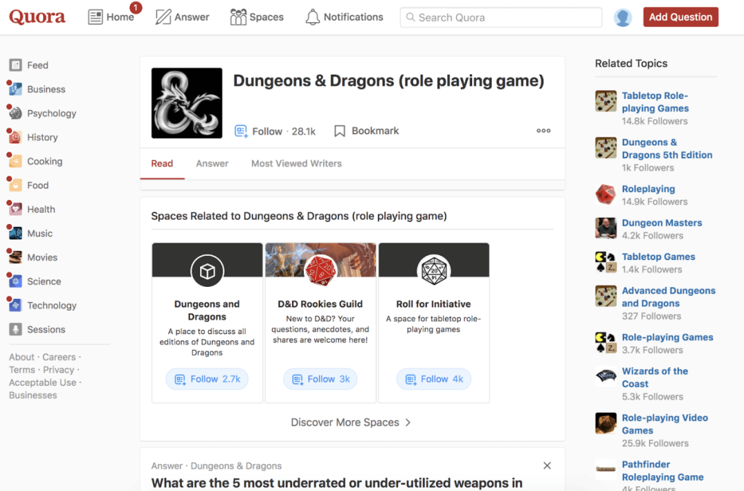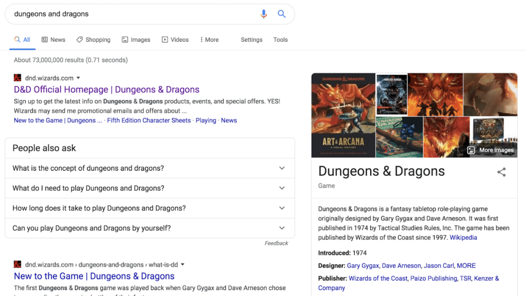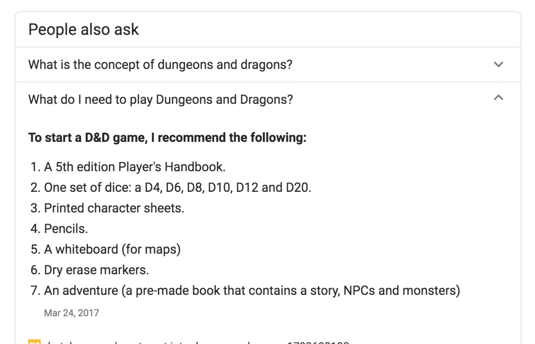 在搜索结果页面,我们可以很快发现“People also ask”这个选项,然后其中有一个问题是关于“What do I need to play Dungeons and Dragons?”,这明显就是和具体产品相关的问题,我们可以继续深挖下去。