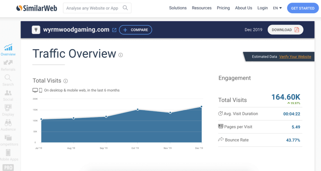 如上图所示,Google shopping里面有显示关于卖这个专用骰子的独立站“Wyrmwood”,还有ETSY和亚马逊上面也都有卖,说明这个产品还是有不错的市场。同时我们可以把独立站“Wyrmwood”丢到流量测算工具“similarweb”里面去测算一下,从而判断出来这个产品的一个热度以及关注度:
