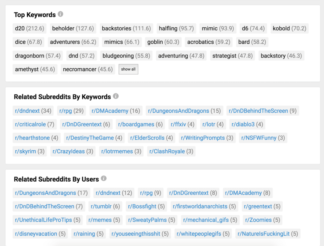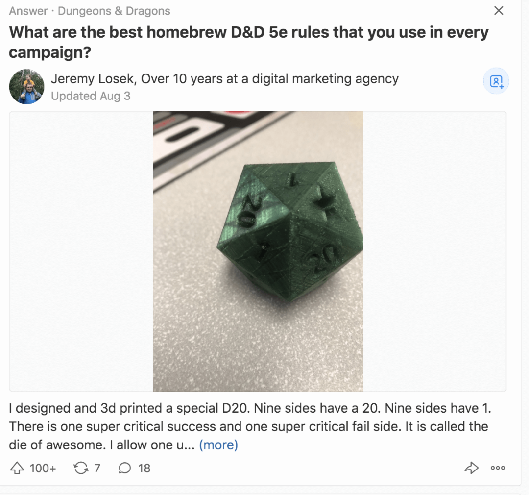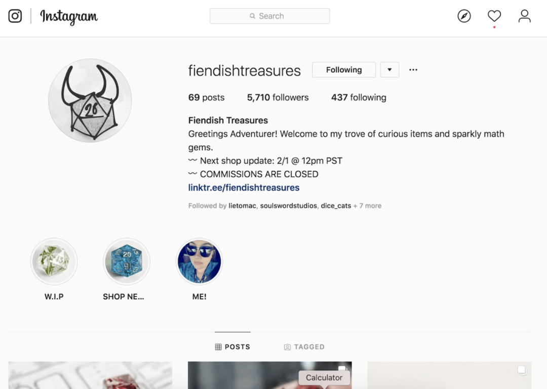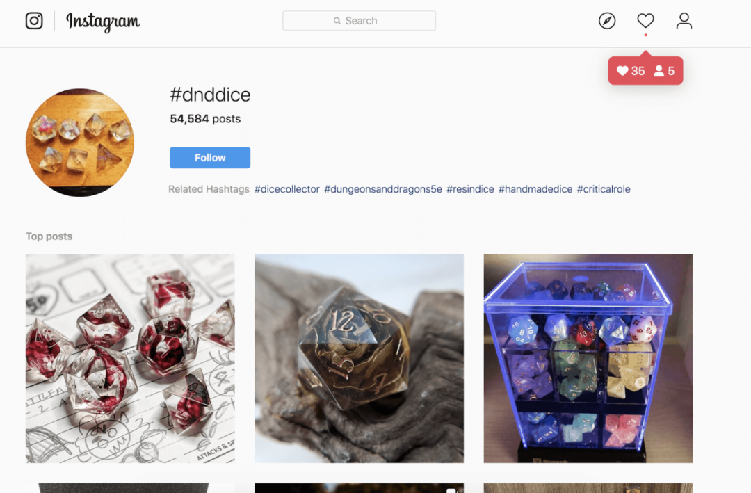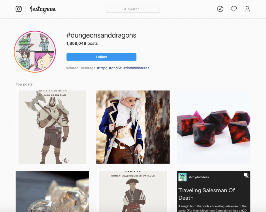 除了Google搜索以外,我们还可以利用ins来做产品深挖,比如通过找到与“Dungeons and Dragons”相关的话题(类似微博里面的话题),也就是下图里面# Dungeons and Dragons部分,利用这个话题可以follow可以点击的特性,去找到相应带货的网红以及与产品相关的帖子来做深度挖掘: