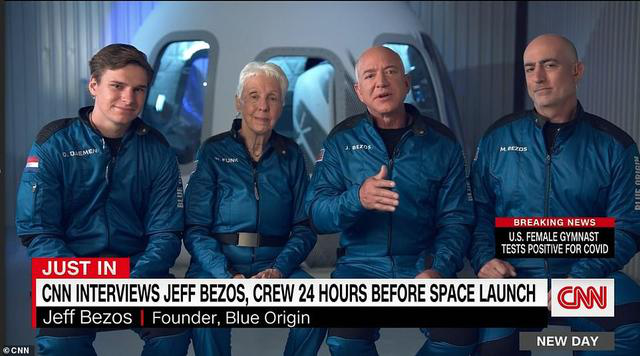 与贝索斯一起前往太空的还包括:82岁的美国退役女飞行员沃利·冯克,去年刚高中毕业、持有私人飞机驾驶执照的物理系学生奥利佛·戴蒙,以及贝索斯的弟弟马克·贝索斯。来源CNN