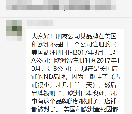 昨日,一位卖家在侃侃精英社群爆料称,自己朋友的一个美国站小店铺因二刷挂了,不仅品牌被删除,更是波及到了欧洲、日本、澳洲站,凡是有这个品牌的店铺全部被封了!