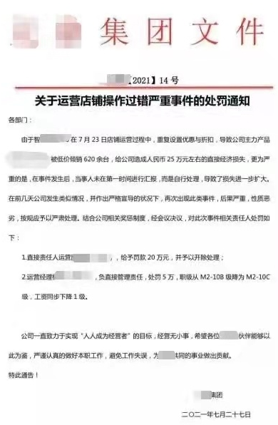 据早前在圈内流传的一张处罚通知文件显示,一位运营人员在店铺运营中,因重复设置优惠与折扣,导致公司主力产品被低价倾销620余台,给公司造成直接经济损失25万元。更严重的是,事件发生后,运营人员没有第一时间汇报,而是自行处理,导致损失进一步扩大。于是,公司决定对该运营人员罚款20万元,并予以开除处理。相关的运营经理被罚款5万元,并予以降级处理。