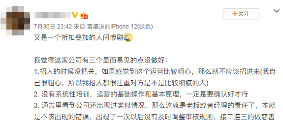 如他所说,原本可以避免的损失,现在实实在在地发生了。显然,该公司的招聘负责人没有做好人员把关,让一些不入流的马虎运营上了手,才会多次遭受损失。这也难怪在运营操作失误被罚款后,大家的反应都偏向于指责公司一方了,这口锅,也确实该公司来背。