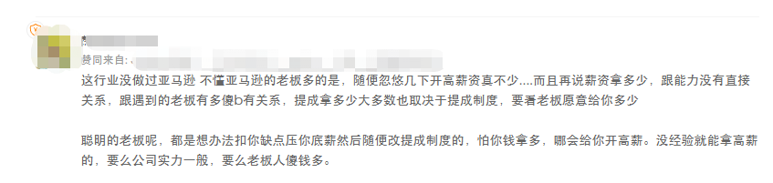 有卖家在分析之后,认为“这行业没做过亚马逊,不懂亚马逊的老板多的是,随便忽悠几下开高薪资真不少....而且再说薪资拿多少,跟能力没有直接关系,跟遇到的老板有多傻有关系。没经验能拿到高薪的,要么公司实力一般,要么老板人傻钱多。擅长忽悠的人基本上混得都不错,他们不害怕露馅,如果露馅就换一家接着忽悠,总能遇到一些傻老板。”